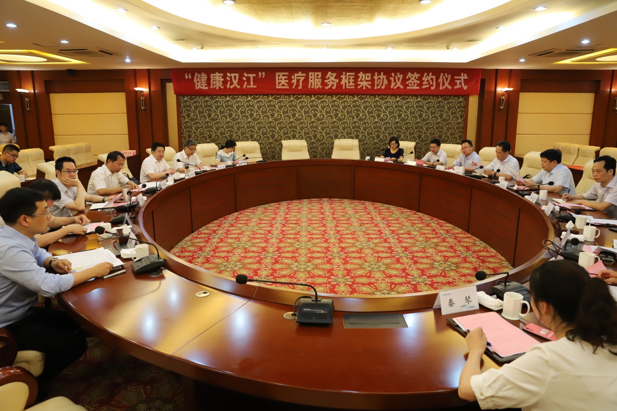 会上,交割工作组代表汇报了交割工作完成情况。陈家华与何宏生共同签署了《项目交割文件移交协议》和《“健康汉江”医疗服务框架协议》。徐周明从医疗服务、健康咨询和培训、健康管理、其他健康服务等四个方面汇报了框架协议的工作安排。